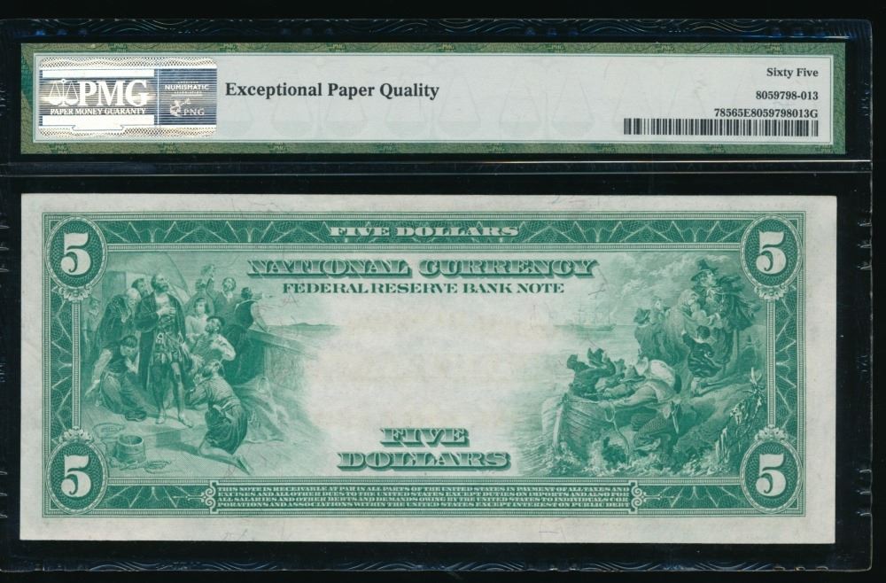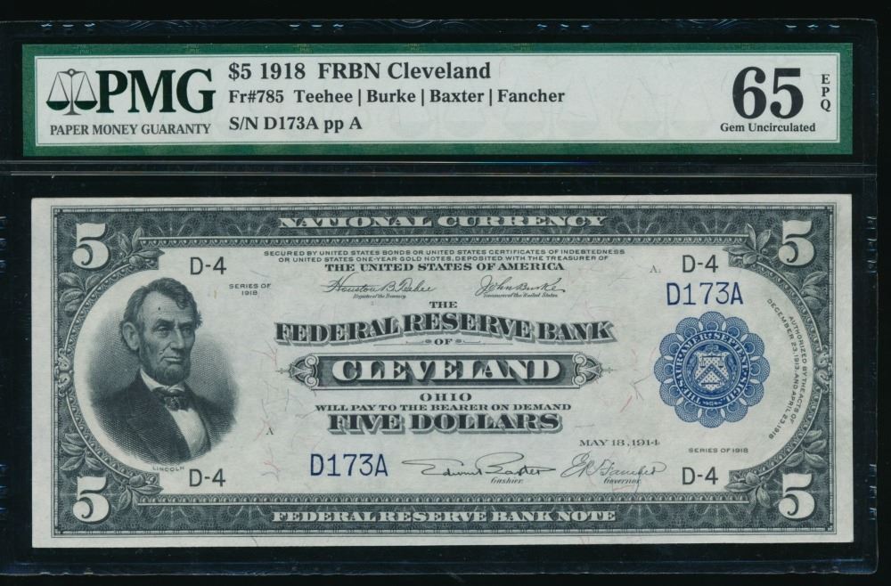 One 1918 $5 Cleveland FRBN PMG 65EPQ.