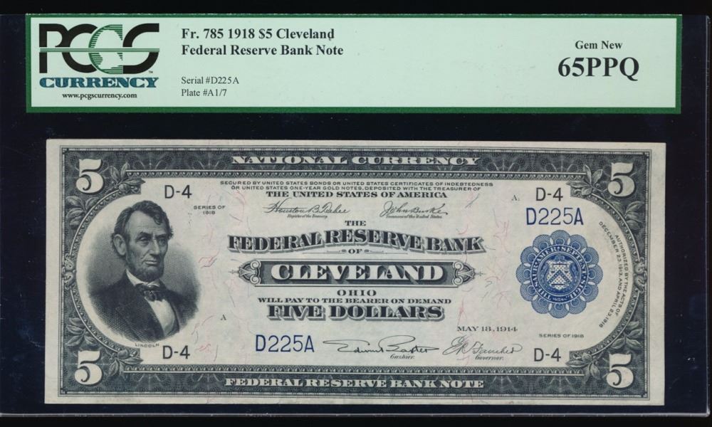 One 1918 $5 Cleveland Federal Reserve Bank Note PCGS 65PPQ.
