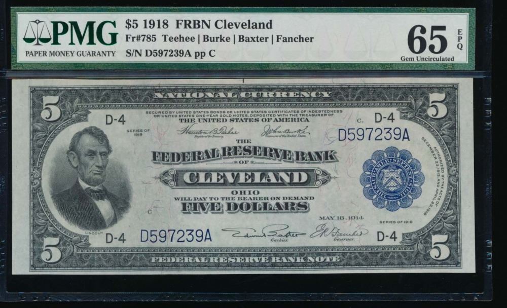 One 1918 $5 Cleveland Federal Reserve Bank Note PMG 65EPQ.