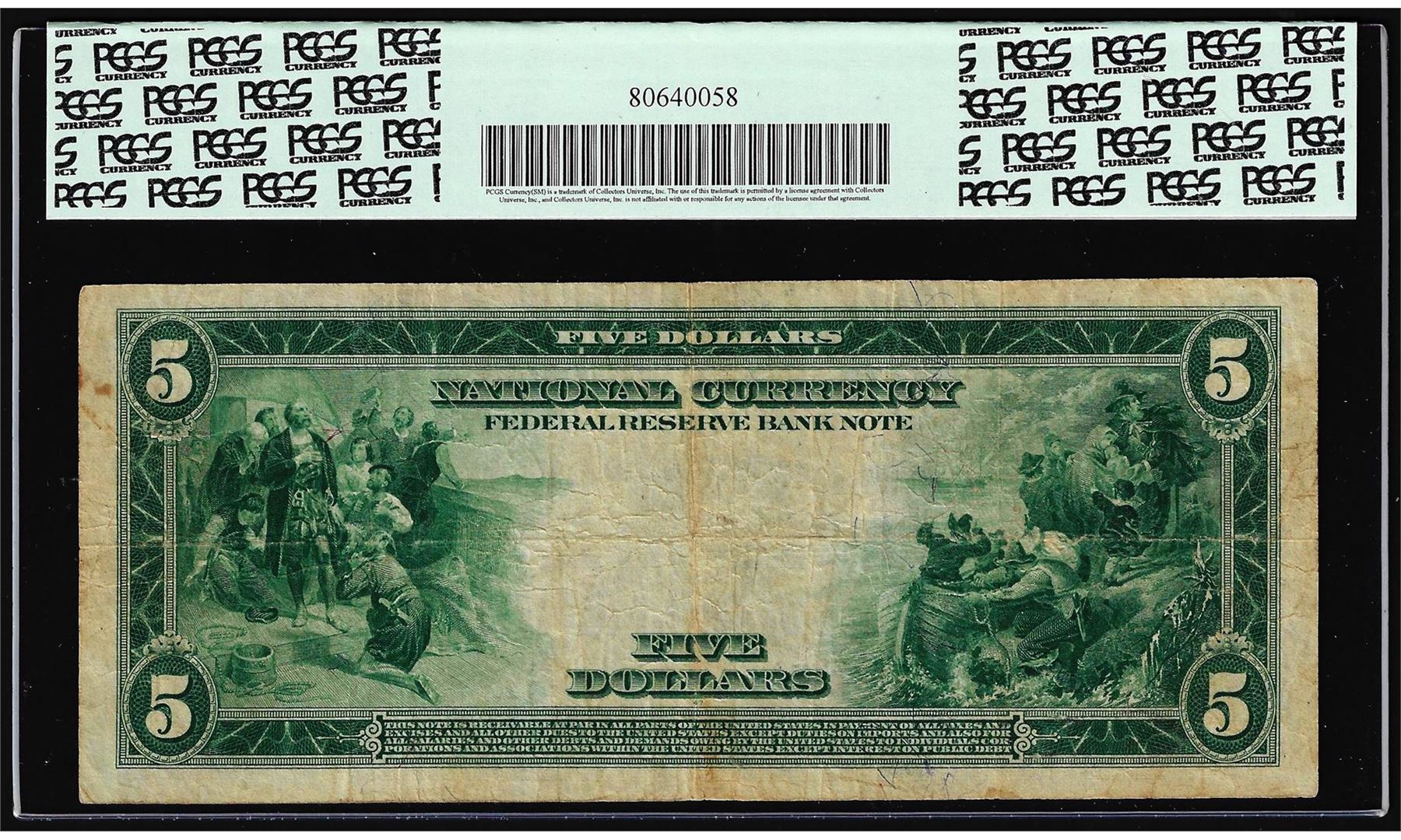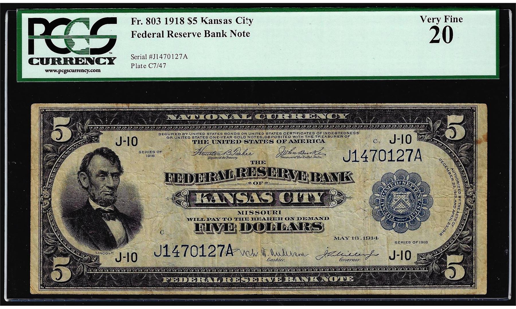 1918 $5 Federal Reserve Bank Note Kansas City Fr.803 PCGS Very Fine 20