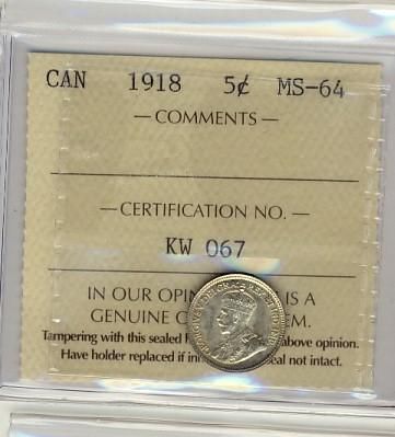 1918 5¢ ICCS MS64. Hint of gold with lots of lustre.