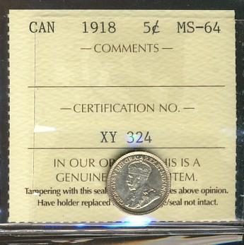 1918 5¢ ICCS MS64