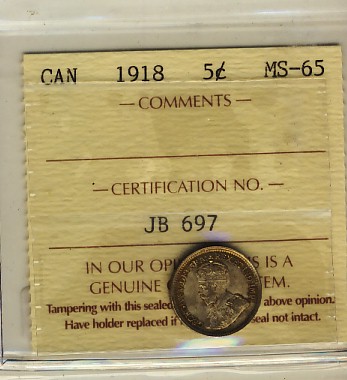 1918 5¢ ICCS MS65, lightly toned. Nice.