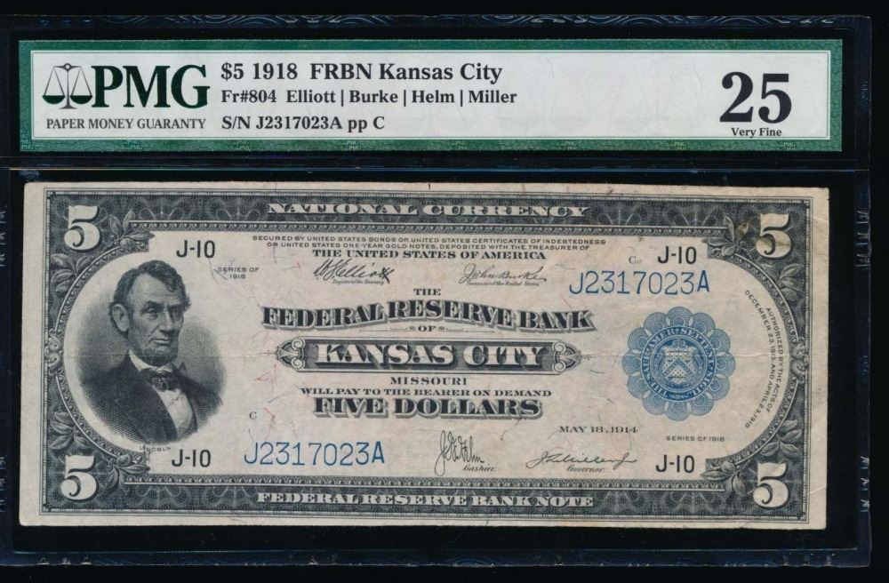 One 1918 $5 Kansas City Federal Reserve Bank Note PMG 25.