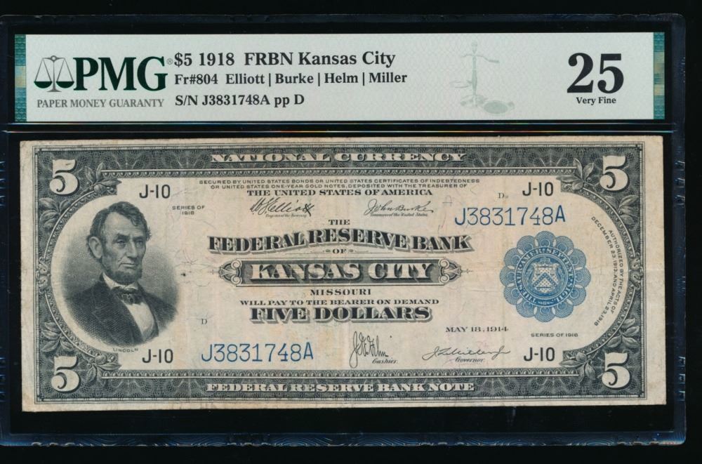 One 1918 $5 Kansas City Federal Reserve Bank Note PMG 25.