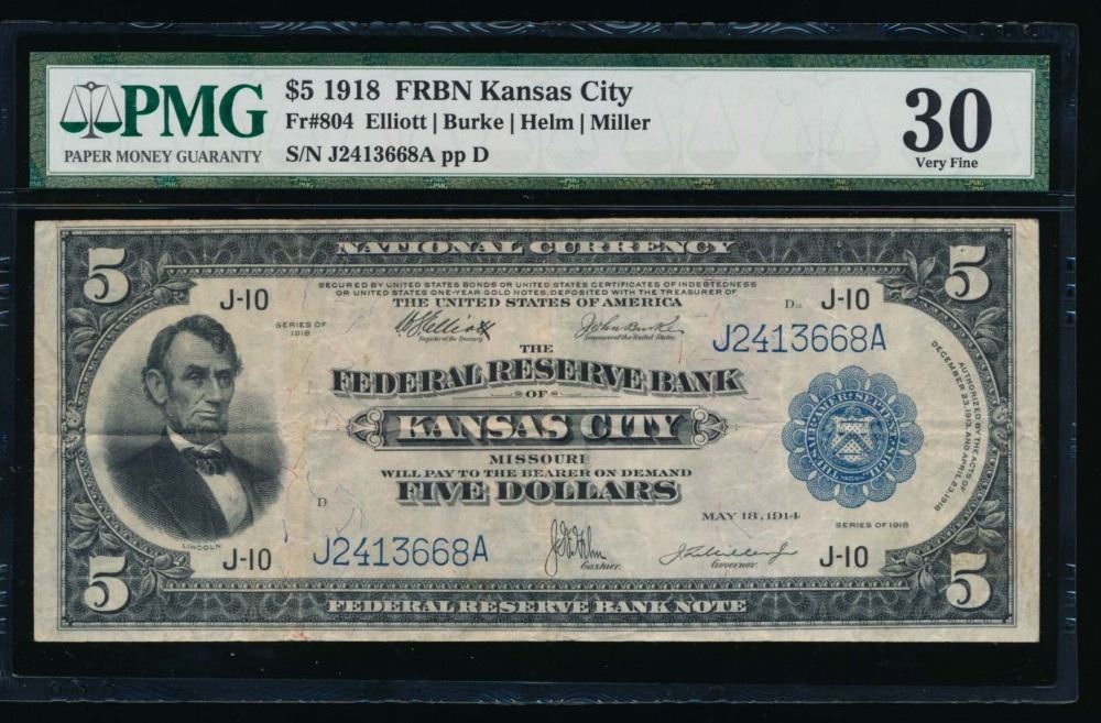 One 1918 $5 Kansas City Federal Reserve Bank Note PMG 30.
