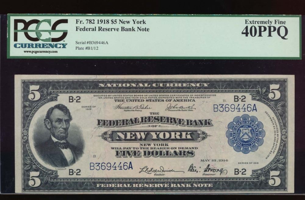 One 1918 $5 New York Federal Reserve Bank Note PCGS 40PPQ.