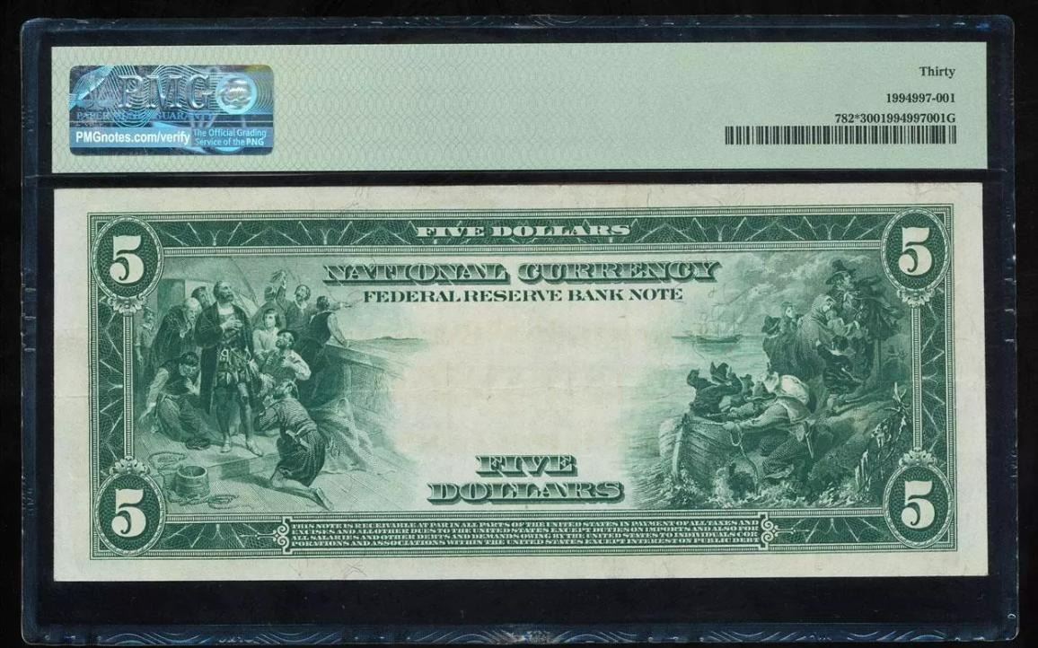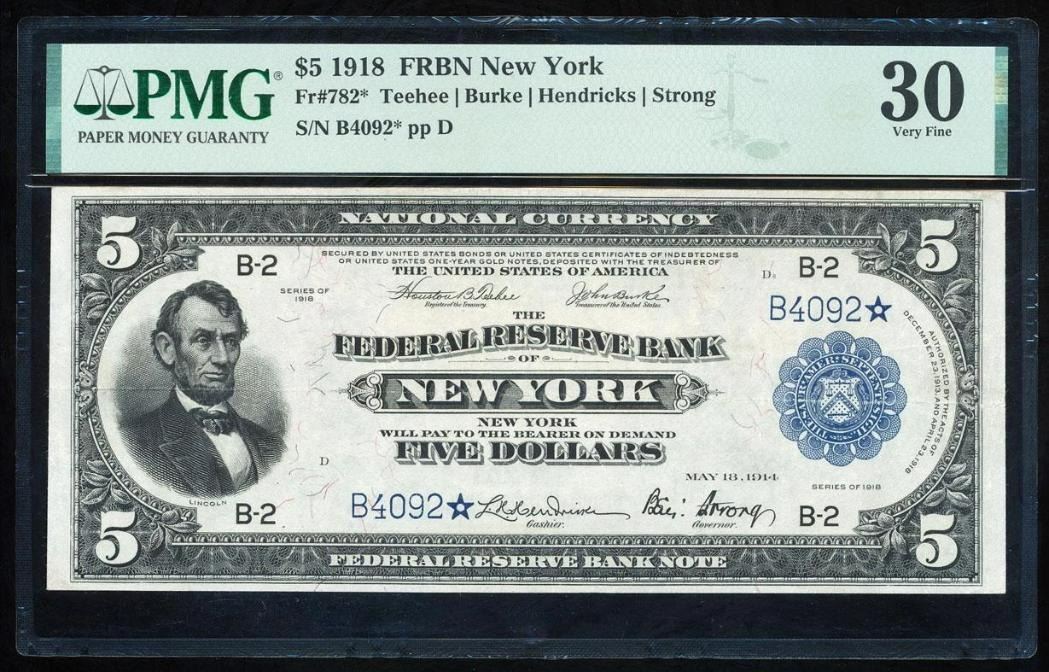 One 1918 $5 STAR New York FRBN PMG 30.