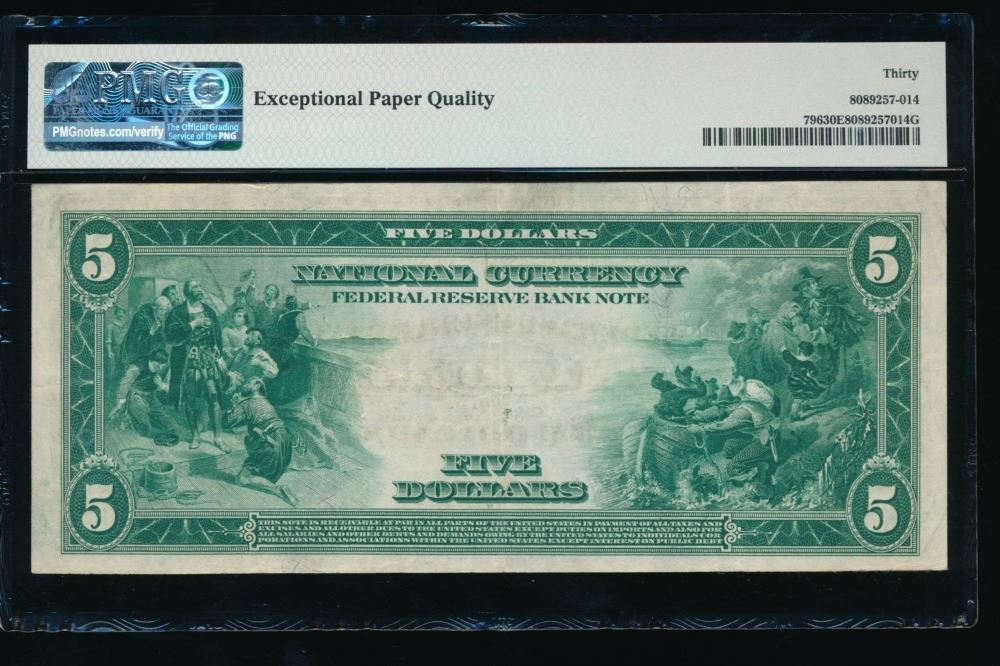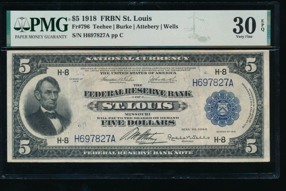 One 1918 $5 St Louis FRBN PMG 30EPQ.
