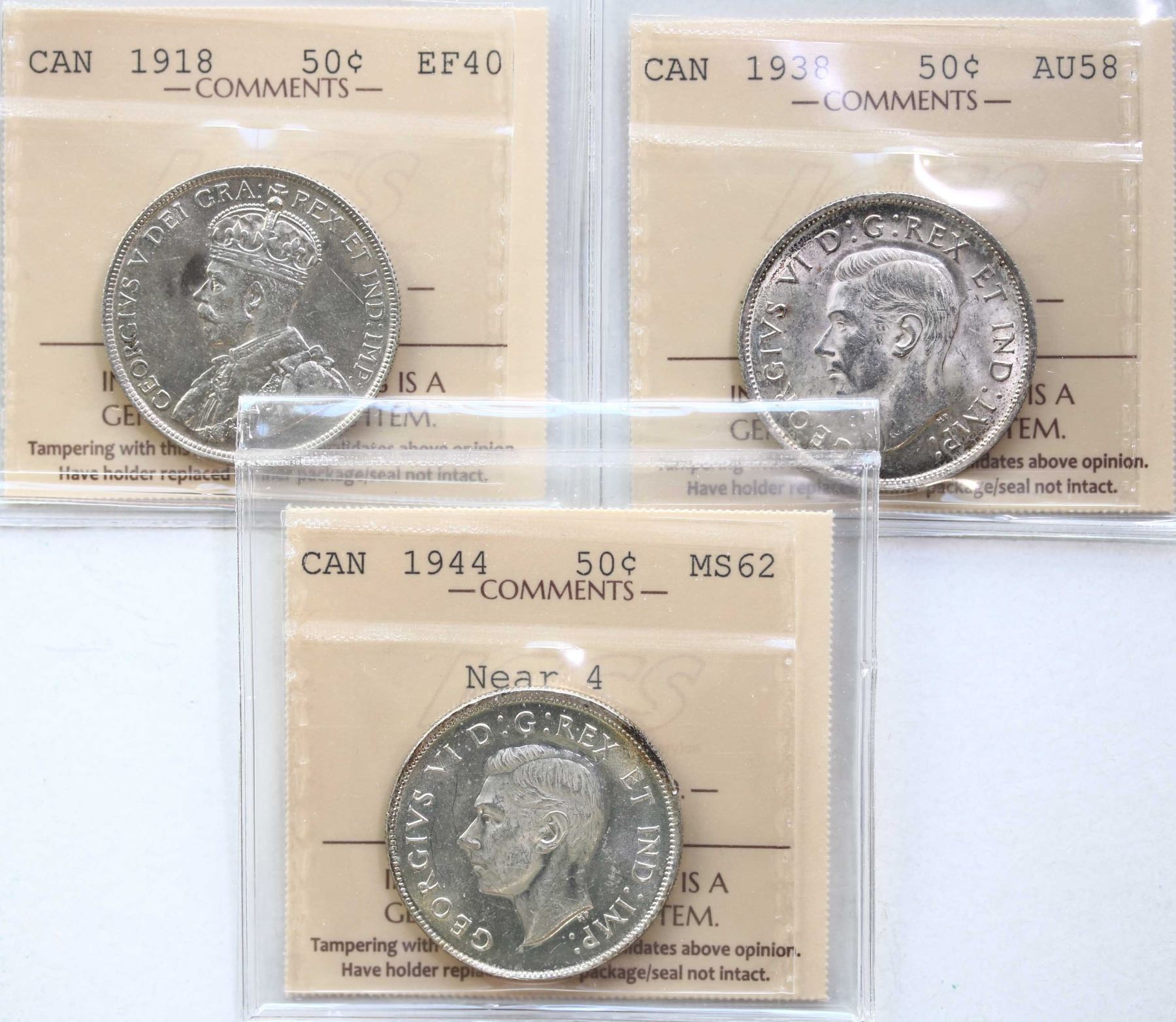 1918 50¢, 1938, 1944 "Near 4", All 3 coins ICCS Extra Fine-40 to Choice Mint State-62.