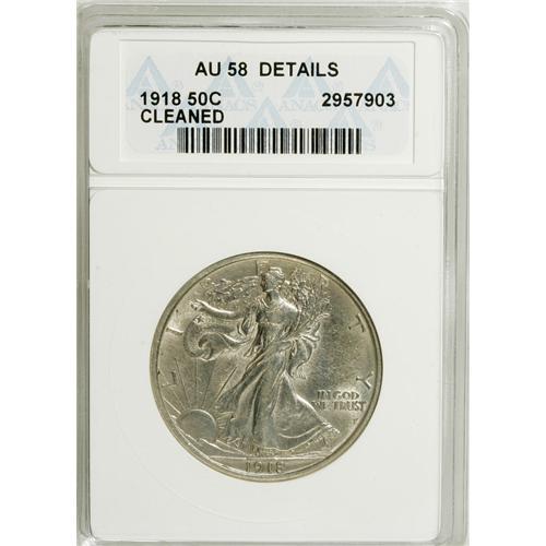 <B>1918 50C --Cleaned--ANACS. AU58 Details.</B></I> NGC Census: (69/424). PCGS Population (83/479). Mintage: 6,634,000. Numismedia Wsl. Price: $400. (#6574)<BR><BR><b>Shipping:</b> Coins & Currency (<a target="_blank" href="http://www.heritageauctions.com/common/shipping.php">view shipping information</a>)