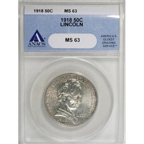 <B>1918 50C Lincoln MS63 ANACS.</B></I> NGC Census: (475/2902). PCGS Population (1229/3632). Mintage: 100,058. (#9320)<BR><BR><b>Shipping:</b> Coins & Currency (<a target="_blank" href="http://www.heritageauctions.com/common/shipping.php">view shipping information</a>)
