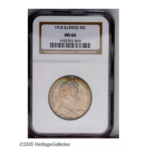 <B>1918<50C> Lincoln MS66 NGC.</B></I> Pretty mauve-gray toning with reddish-gold peripheral accents bathe highly lustrous surfaces. Sharply struck, with no mentionable marks.