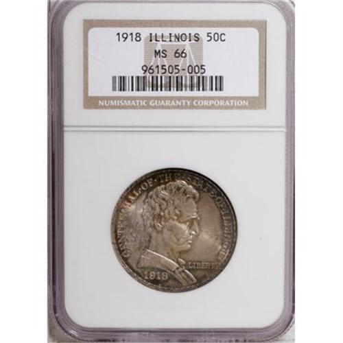 <B>1918 50C Lincoln MS66 NGC.</B></I> Green-gray patina graces most of both sides, while olive, yellow-green, and strawberry colors appear at the peripheries. Decisively struck with lovely luster and the clean appearance shared by the finest representatives of this first statehood centennial issue.<BR><BR><b>Shipping:</b> Coins & Currency (<a target="_blank" href="http://www.heritageauctions.com/common/shipping.php">view shipping information</a>)