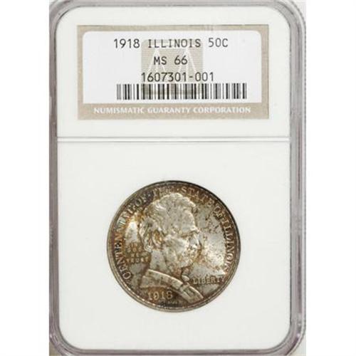 <B>1918 50C Lincoln MS66 NGC.</B></I> Although the coin celebrates the centennial of Illinois statehood in 1818, its more prevalent nickname today is the "Lincoln". This coin offers lovely ice-blue, amber, and silver-gray surfaces with radiant luster and a premium appearance.<BR><BR><b>Shipping:</b> Coins & Currency (<a target="_blank" href="http://www.heritageauctions.com/common/shipping.php">view shipping information</a>)