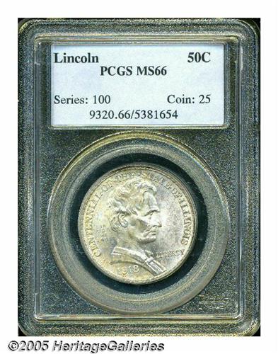 <B>1918<50C> Lincoln MS66 PCGS.</B></I> Well struck and vibrantly lustrous, with speckled russet, golden-brown, and pink-red toning sprinkled mostly near the borders and in the fields, on each side. A couple of small milling marks are located on the obverse, including one on Lincoln's face near the mouth, but the sparkling surfaces seem to be nearly pristine otherwise.