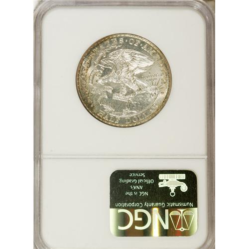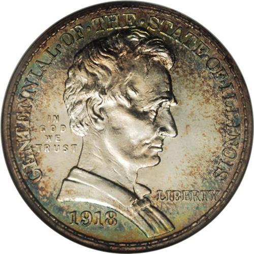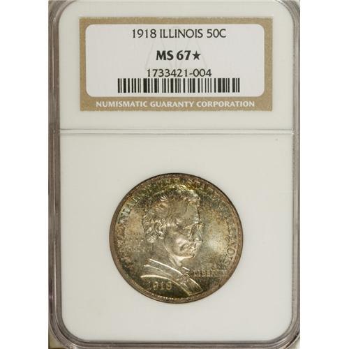 <B>1918 50C Lincoln MS67 <img border='0' src='http://www.heritagecoins.com/images/star.gif' width=10 height=10> NGC.</B></I> This is one of the few commemoratives that has no established nomenclature; NGC calls it the Illinois, while PCGS favors Lincoln, and still others include both names as a compromise. Whatever one calls it, the design is one of the most acclaimed, and the Superb Gem offered here is a great example. Dappled gold and violet patina graces the obverse rim, while a hint of similar color appears at the left and right reverse margins. NGC has graded just three pieces as MS67 <img border='0' src='http://www.heritagecoins.com/images/star.gif' width=10 height=10> and only three coins finer (4/07).<BR><I>From The Cary & Cheryl Porter Collection.</B></I><BR><BR><b>Shipping:</b> Coins & Currency (<a target="_blank" href="http://www.heritageauctions.com/common/shipping.php">view shipping information</a>)