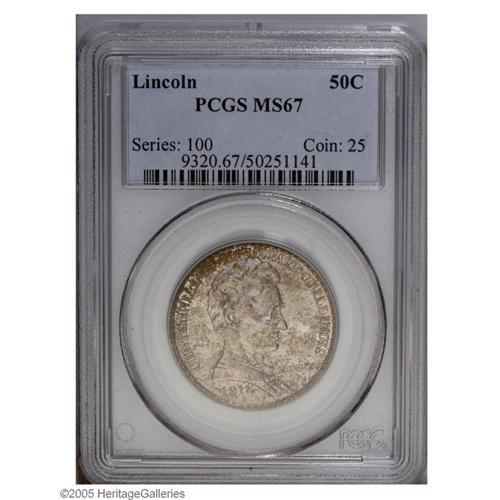 <B>1918<50C> Lincoln MS67 PCGS.</B></I> An amazing Superb Gem example, and seldom seen so fine. The surfaces are brilliant silvery-white with considerable golden-brown and iridescent toning on the obverse. A few similar splashes appear on the reverse. Few examples of this commemorative issue have surfaces so nearly flawless. Population: 79 in 67, 1 finer (10/05).