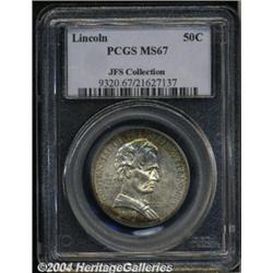 <B>1918<50C> Lincoln MS67 PCGS.</B></I> A strikingly original Superb Gem, with shades of mottled lime-green, maroon, crimson, and apricot patina appearing on the obverse, and just a trace of light scattered toning on the reverse. The luster is very strong, and the strike shows complete design details. The surfaces are nearly mark-free, with a few small nicks near Lincoln's mouth and temple as the only visible surface impairment. An outstanding example that would be nearly impossible to improve upon. Population: 67 in 67, 0 finer (6/04).<BR><I>From the JFS Collection, the #1 All-Time PCGS Registry Set.</B></I> <BR><BR><B>Important notice:</B> Heritage usually auctions material at the rate of 200-250 lots per hour. On some occasions eBay Live bid software or the Internet may not be able to keep up with the pace of the auction. We recommend placing a realistic absentee bid now as insurance to avoid disappointment. Occasionally the auctioneer may eliminate or reject an eBay Live bid, and the auctioneer may also reopen a lot after the close of the eBay live bidding (usually because we missed an audience bid), and may reject your bid even if it shows you as the winning bidder. By bidding via eBay Live, you agree that Heritage may award the lot to another bidder at its sole discretion under the circumstances described above or any other reasonable circumstances. Since eBay bids are not shown to us until we open the lot on the floor, we treat those bids just like floor bids. In most cases the floor responds before the eBay bid is presented to us, due to Internet lag time, so for consistency we have made it a policy that floor bids are always considered first over tie eBay live bids. Also please note that all Heritage lots purchased through eBay Live carry a 20% Buyer's Premium. Please make sure you read the Terms and Conditions before you bid. </span></font></tr></table></td></tr></table>