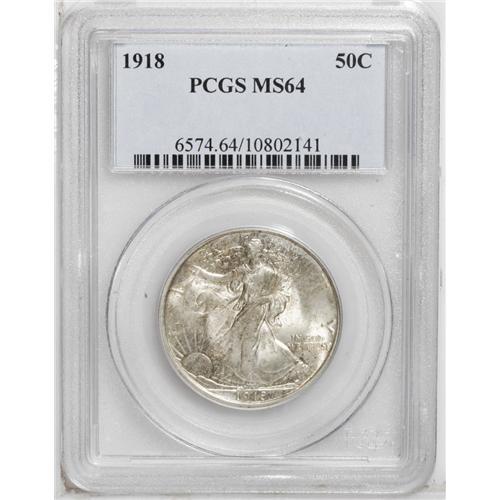 <B>1918<50C> MS64 PCGS.</B></I> Smoke-gray with a few dark toning spots. The thumb is well-defined and Liberty's head details are adequate, though some weakness is seen on the eagle's breast. Appealing with only trivial marks.