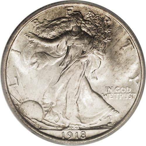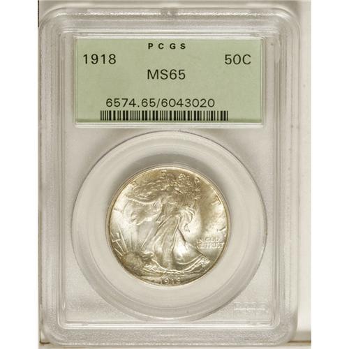 <B>1918 50C MS65 PCGS.</B></I> The 1918 is somewhat difficult to acquire in full Gem, and rare any finer. This MS65 displays bright, fully lustrous surfaces that are visited by wisps of olive-gray toning, and occasional sky-blue and gold accents. The design elements are sharply impressed, and reveal virtually full definition on Liberty's left hand and adjacent branches. A few minute marks define the grade. Population: 77 in 65, 7 finer (10/06).<BR><BR><b>Shipping:</b> Coin/Currency (<a target="_blank" href="http://www.heritageauctions.com/common/shipping.php">view shipping information</a>)