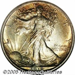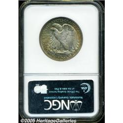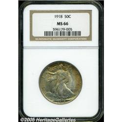 <B>1918 50C MS66 NGC.</B></I> This is a frosty Gem with exquisite surfaces and amazing color. Both sides are sharply detailed with nearly full design elements. In fact, the thumb is complete and the sandals are fully defined. Even the toes on her left foot are sharply detailed as if she just had a fresh pedicure. Light silvery-white color is visible and the centers on each side, and this is surrounded by deep orange and pale sea-green color. This example is tied for finest known and will surely please the connoisseur. Population: 7 in 66, 0 finer (2/05).
