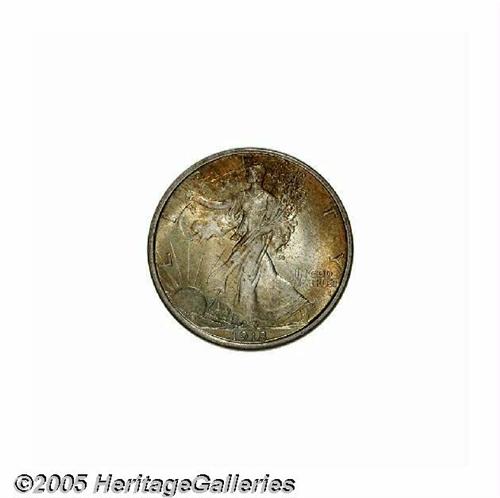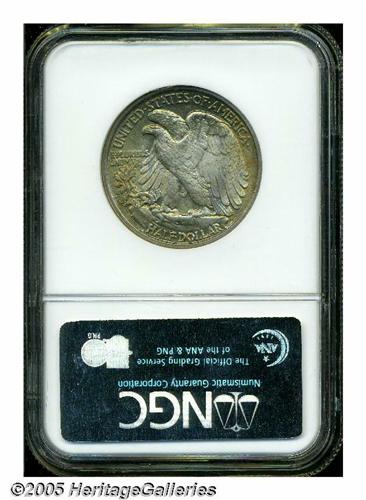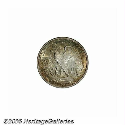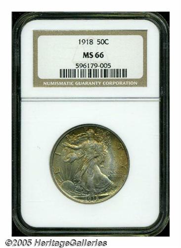 <B>1918<50C> MS66 NGC.</B></I> This is a frosty Gem with exquisite surfaces and amazing color. Both sides are sharply detailed with nearly full design elements. In fact, the thumb is complete and the sandals are fully defined. Even the toes on her left foot are sharply detailed, as if she just had a fresh pedicure. Light silvery-white color is visible near the center of each side, and this is surrounded by deep orange and pale sea-green color. This example is tied for finest known and will surely please the connoisseur. Population: 7 in 66, 0 finer (6/05).