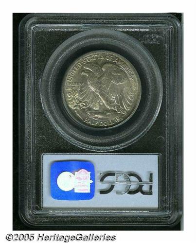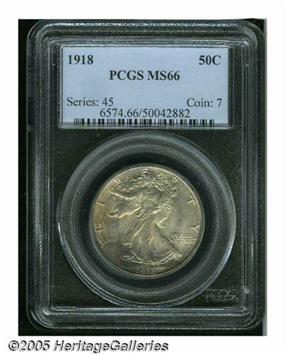 <B>1918<50C> MS66 PCGS.</B></I> Several positive attributes come together on this wonderfully preserved early Walker. An excellent strike and bright, shimmering surfaces are enhanced by splendid blushes of orange and rose iridescent toning on the obverse, while reddish-golden accents are seen here and there on the reverse. This is quite sharply struck with a full thumb, strong head details, and nearly complete skirt lines. The only critique we can make is the presence of a few small marks on Liberty's neck. Population: 7 in 66, 0 finer (6/05).<BR><I>From The Robert Moreno Collection.</B></I>