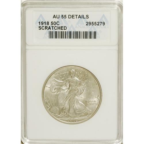 <B>1918 50C --Scratched--ANACS. AU55 Details.</B></I> NGC Census: (30/992). PCGS Population (38/565). Mintage: 6,634,000. Numismedia Wsl. Price for NGC/PCGS coin in AU55: $275. (#6574)<BR><BR><b>Shipping:</b> Coins & Currency (<a target="_blank" href="http://www.heritageauctions.com/common/shipping.php">view shipping information</a>)