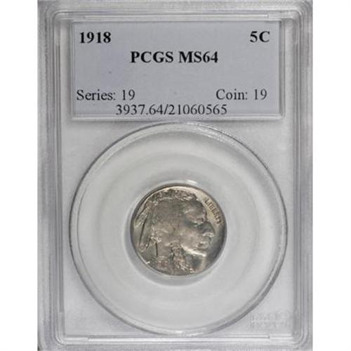 <B>1918 5C MS64 PCGS.</B></I> PCGS Population (329/202). NGC Census: (190/69). Mintage: 32,086,314. Numismedia Wsl. Price for NGC/PCGS coin in MS64: $420. (#3937)<BR><BR><B>Coin Engraver:</B> James E. Fraser<BR><BR><b>Shipping:</b> Coins & Currency (<a target="_blank" href="http://www.heritageauctions.com/common/shipping.php">view shipping information</a>)