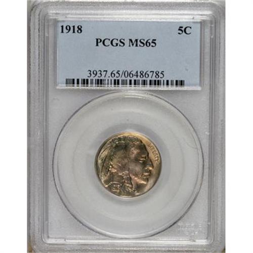 <B>1918 5C MS65 PCGS.</B></I> The low survival rate of this high-mintage issue is surprising, but it seems clear that few were saved from circulation. Currently, less than a thousand pieces have been certified in Mint State by NGC and PCGS combined (4/07). This Gem example is lustrous and nearly pristine, with light rose and mint-green toning. Surface marks are essentially nonexistent. <BR><BR><b>Shipping:</b> Coins & Currency (<a target="_blank" href="http://www.heritageauctions.com/common/shipping.php">view shipping information</a>)