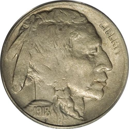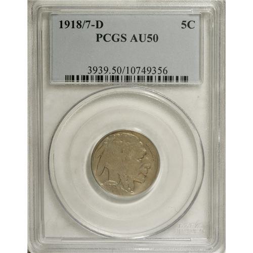 <B>1918/7-D 5C AU50 PCGS.</B></I> FS-016.5. Though the 1918/7-D ranks among the most desirable 20th-century varieties, it attracted little attention immediately after its announcement in 1931, and many examples circulated for years. While examples with significant wear are often available for a price, pieces that approach Mint State remain elusive and are always in demand.<BR> The peach-tinged gold-gray surfaces of this About Uncirculated example retain considerable quicksilver luster, and a diagonal line of brick-red patina crosses the Indian's lips. Though the central devices display a degree of softness consistent with die erosion, the date is bold, particularly the all-important final digit. An appealing, lightly circulated example of this classic Buffalo nickel variety.<BR><BR><b>Shipping:</b> Coins & Currency (<a target="_blank" href="http://www.heritageauctions.com/common/shipping.php">view shipping information</a>)