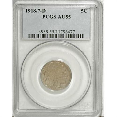 <B>1918/7-D 5C AU55 PCGS.</B></I> Among the most popular <I>and </B></I>rarest of the Buffalo nickel varieties, the 1918/7-D bears a close kinship with the 1918/7-S quarter and the 1942/1 (P and D) dime errors. All were dual-hub errors produced in a wartime rush to produce minor coinage to stimulate the economy. The 1918/7-D nickel is second only to the 1916 Doubled Die Buffalo in rarity. Most examples encountered grade only Very Good, a function of their discovery a dozen or more years after they were produced. <BR> This incredible, high grade example boasts still-lustrous grayish-gold surfaces on each side that are minimally abraded. The obverse is an early die state, with only a trace of the normally small, diagnostic die crack that runs onto the Indian's cheek from near the braid. The misshapen designer's initial F looks like a P on this variety, also diagnostic, and both the horizontal crossbar and diagonal downstroke of the 7 are bold and complete under the 8. The reverse boasts a full horn and is lightly rotated (20 degrees) counterclockwise.<BR><BR><B>Coin Engraver:</B> James E. Fraser<BR><BR><b>Shipping:</b> Coins & Currency (<a target="_blank" href="http://www.heritageauctions.com/common/shipping.php">view shipping information</a>\)