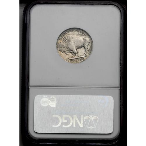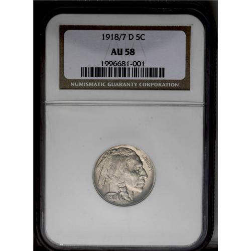 <B>1918/7-D<5C> AU58 NGC.</B></I> The history of numismatics is filled with stories of treasures found in attics, basements, closets, and other unlikely places. On March 25, 2006, another tale began. A resident of Los Banos, California, brought a small bag of coins to Thoreson Numismatics. The man, who wishes to remain anonymous, said he found a plastic bag of coins in an old trunk while he was sorting through his parents' belongings. Most were common, but one was a spectacular 1918/7-D nickel, one of the three most sought-after varieties in the Buffalo nickel series. The story (as distributed by Knight/Ridder Tribune News Service) appeared in California newspapers, and an article appeared on page 3 of the May 22, 2006 issue of <I>Coin World.</B></I><BR> This example is the optimal grade for Buffalo nickel collectors, providing the eye appeal and technical qualities of a full Mint State specimen, yet saving considerable money. The overdate is bold, and the diagnostic misshapen designer's initial is plain. Both sides show the usual weakness often seen on these coins, with a trace of wear also visible on the highpoints. The surfaces have virtually full satiny luster and light champagne toning, providing excellent eye appeal. A tiny scrape between IB and the Indian's brow is the only significant defect. Otherwise, the surfaces are remarkably clean. In addition to prominent overdate features, slight machine doubling of the date and LIBERTY are also visible. This coin, associated with a wonderful tale of discovery, is sure to inspire spirited bidding. Census: 20 in 58, 29 finer (7/06).
