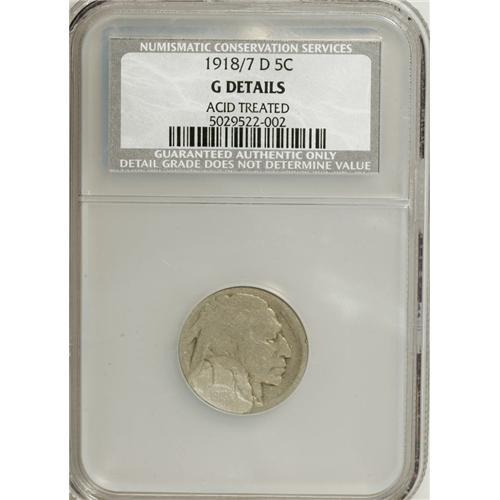 <B>1918/7-D 5C --Acid Treated--NCS. Good Details.</B></I> The area from the braid through the date to the rim has been acid-treated, and is a lighter silver-gray color than the rest of the dove-gray surfaces. The NCS designation as an overdate is particularly valuable, since only the tops of the underlying 7 are readily distinguishable to this cataloger, while the downstroke of the 7 is difficult to make out.<BR><BR><b>Shipping:</b> Coins & Currency (<a target="_blank" href="http://www.heritageauctions.com/common/shipping.php">view shipping information</a>)