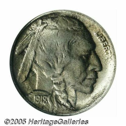 <B>1918/7-D<5C>--Corroded, Whizzed--ANACS. XF Details, Net VF20.</B></I> A bright apricot and powder-blue piece. The minutely pitted surfaces exhibit unnatural cartwheel luster. The upper right corner of the 7 underdigit is apparent when viewed beneath a glass. Second only to the doubled die 1916, in terms of rarity within the series.