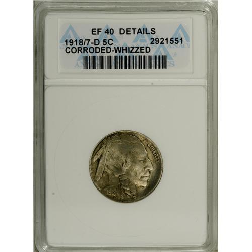 <B>1918/7-D 5C --Corroded, Whizzed--ANACS. XF40 Details.</B></I> The thick downstroke of the 7 is apparent within the 8 in the date. Examination beneath a glass reveals uniformly micro-pitted surfaces with some smoothing evident in the open fields. Nonetheless, a well-detailed pale gold and gray example of this rare and significant variety.<BR><BR><b>Shipping:</b> Coin/Currency (<a target="_blank" href="http://www.heritageauctions.com/common/shipping.php">view shipping information</a>)