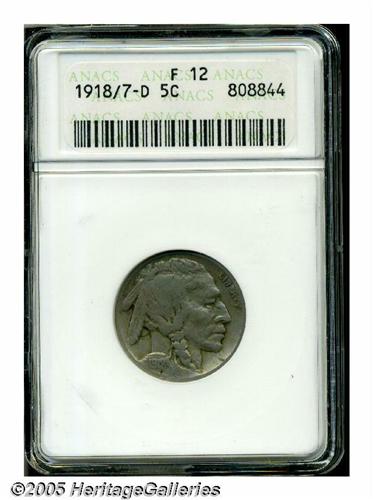 <B>1918/7-D<5C> Fine 12 ANACS.</B></I> An attractive, evenly worn example of this always-popular overdate. The surfaces overall are light gray with deeper gray patina around and within the recesses of the devices. The only defect we see is a tiny mark on the Indian's nose. The underdigit is strong and easily visible without magnification.<BR><I>From The Stig Ericsson Collection.</B></I>