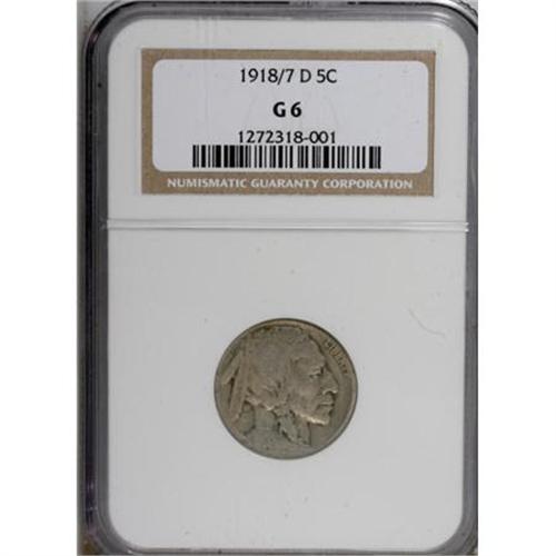 <B>1918/7-D 5C Good 6 NGC.</B></I> Rich mustard-gold toning graces the margins of this heavily circulated overdate nickel. The flat-topped 8 is plain, and on the nickel-gray reverse, the bison shows a stub of horn.<BR><BR><B>Coin Engraver:</B> James E. Fraser<BR><BR><b>Shipping:</b> Coins & Currency (<a target="_blank" href="http://www.heritageauctions.com/common/shipping.php">view shipping information</a>)