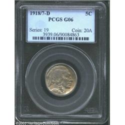<TABLE cellSpacing=0 cellPadding=0 width="100%" bgColor=#000000 border=0><TBODY><TR><TD width="100%"><TABLE cellSpacing=1 cellPadding=3 width="100%" border=0><TBODY><TR><TD width="100%" bgColor=#79735c><FONT face=arial color=#ffffff size=3><B>Description</B> </FONT></TD></TR><TR><TD width="100%" bgColor=#ffffff><FONT face=arial size=2><B>1918/7-D 5C Good 6 PCGS.</B></I> Dusky honey-gold patina endows the fields, while the devices have pale lilac color. The date is well worn but each digit is readily apparent. The thick central stroke in the 8 affirms the overdate. The devices are nicely detailed for the grade. A faint curved abrasion below the bison's head is the sole distraction, as the wispy diagonal streak along the right reverse border is of mint origin. </FONT></TD></TR></TBODY></TABLE></TD></TR></TBODY></TABLE><BR><A name=PricesRealized></A><TABLE cellSpacing=0 cellPadding=0 width="100%" bgColor=#000000 border=0><TBODY><TR><TD width="100%"><TABLE cellSpacing=1 cellPadding=3 width="100%" border=0><TBODY><TR><TD width="100%" bgColor=#79735c><A name=PR><FONT face=arial color=#ffffff size=3><B>Previous Prices from Heritage Auctions</B> </FONT></A></TD></TR><TR><TD bgColor=#f6f6ed><TABLE cellSpacing=0 cellPadding=0 width="100%" border=1><TBODY><TR><TD align=middle width="33%"><B>Date</B></TD><TD align=middle width="33%"><B>Service</B></TD><TD align=middle width="33%"><B>Price</B></TD></TR><TR bgColor=whitesmoke><TD width="33%"><B>08/05/2000</B></TD><TD width="33%">PCGS</TD><TD width="33%">$356.50</TD></TR><TR bgColor=whitesmoke><TD width="33%"><B>03/23/2003</B></TD><TD width="33%">ANACS</TD><TD width="33%">$747.50</TD></TR></TBODY></TABLE></TD></TR><TR><TD bgColor=#ffffff><FONT face=arial size=1 ?>PLEASE NOTE: All prices realized reflect the final hammer price PLUS the buyer's premium in auctions that charge a buyer's premium. Each item has a notation at the top of the listing indicating whether that lot included a buyer's premium. Example: A item that sells with a final hammer price of $100 and a 20% buyer's premium will display with a price realized of $120. All information listed is intended to be as accurate as possible, but errors are possible. Please use this guide carefully and inform us of any inaccuracies. </FONT></TD></TR></TBODY></TABLE></TD></TR></TBODY></TABLE><BR><TABLE cellSpacing=0 cellPadding=0 width="100%" bgColor=#000000 border=0><TBODY><TR><TD width="100%"><TABLE cellSpacing=1 cellPadding=3 width="100%" border=0><TBODY><TR><TD width="100%" bgColor=#79735c colSpan=6><FONT face=arial color=#ffffff size=3><B>Price Guide*</B> </FONT></TD></TR><TR bgColor=#f6f6ed><TD align=middle><B>Grade</B> </TD><TD align=middle><B>Coin World<BR>(Trends)</B> </TD><TD align=middle><B>Numismedia<BR>Retail</B> </TD><TD align=middle><B>Numismedia<BR>Wholesale</B> </TD><TD align=middle><B>Coin<BR>Universe</B> </TD><TD align=middle><B>Heritage<BR>Value Index</B> </TD></TR><TR bgColor=#ffffff><TD align=middle>4</TD><TD align=right>$900.00</TD><TD align=right>$456.00</TD><TD align=right>$380.00</TD><TD align=right>$500.00</TD><TD align=right>$523.13</TD></TR><TR style="FONT-WEIGHT: bold" bgColor=#cccfdd><TD align=middle>6</TD><TD align=right>---</TD><TD align=right>---</TD><TD align=right>---</TD><TD align=right>---</TD><TD align=right>$745.83</TD></TR><TR bgColor=#ffffff><TD align=middle>8</TD><TD align=right>$1,400.00</TD><TD align=right>$840.00</TD><TD align=right>$700.00</TD><TD align=right>---</TD><TD align=right>$921.38</TD></TR><TR bgColor=#ffffff><TD colSpan=6><FONT size=1>*All information listed is intended to be as accurate as possible, but errors are possible. No item may be returned or refused based on this information which is provided as a service to our customers. You should contact each pricing source directly to determine the accuracy of this information. </FONT></TD></TR></TBODY></TABLE></TD></TR></TBODY></TABLE><BR><TABLE cellSpacing=0 cellPadding=0 width="100%" bgColor=#000000 border=0><TBODY><TR><TD width="100%"><TABLE cellSpacing=1 cellPadding=3 width="100%" border=0><TBODY><TR><TD width="100%" bgColor=#79735c><FONT face=arial color=#ffffff size=3><B>Population Guide</B> </FONT></TD></TR><TR bgColor=#ffffff><TD align=middle><!-- Begin Output of Population Grid--><TABLE cellSpacing=0 cellPadding=0 width="100%" border=0><TBODY><TR><TD vAlign=center><TABLE cellSpacing=0 width="100%" border=1 cellsadding="3"><TBODY><TR><TD vAlign=center><TABLE cellSpacing=0 cellPadding=3 width="100%" border=1><TBODY><TR><TD vAlign=center align=middle bgColor=#f0f1e8 colSpan=2 <CENTER><FONT face=Arial size=2><B>PCGS Pop </B></FONT><CENTER></CENTER></TD><TD vAlign=center align=middle bgColor=#f0f1e8 colSpan=2><CENTER><FONT face=Arial size=2><B>NGC Pop</B></CENTER></FONT></TD></TR><TR><TD vAlign=center><FONT face=Arial size=2>(6)</FONT> </TD><TD vAlign=center align=right><FONT face=Arial size=2>71</FONT> </TD><TD vAlign=center><FONT face=Arial size=2>(6)</FONT> </TD><TD vAlign=center align=right><FONT face=Arial size=2>9</FONT> </TD></TR><TR><TD vAlign=center><FONT face=Arial size=2>(>6)</FONT> </TD><TD vAlign=center align=right><FONT face=Arial size=2>388</FONT> </TD><TD vAlign=center><FONT face=Arial size=2>(>6)</FONT> </TD><TD vAlign=center align=right><FONT face=Arial size=2>166</FONT> </TD></TR></TBODY></TABLE></TD></TR></TBODY></TABLE></TD></TR></TBODY></TABLE><!-- End Output of Population Grid--> Important notice: Heritage usually auctions material at the rate of 200-250 lots per hour. On some occasions eBay Live bid software or the Internet may not be able to keep up with the pace of the auction. We recommend placing a realistic absentee bid now as insurance to avoid disappointment. Occasionally the auctioneer may eliminate or reject an eBay Live bid, and the auctioneer may also reopen a lot after the close of the eBay live bidding (usually because we missed an audience bid), and may reject your bid even if it shows you as the winning bidder. By bidding via eBay Live, you agree that Herit