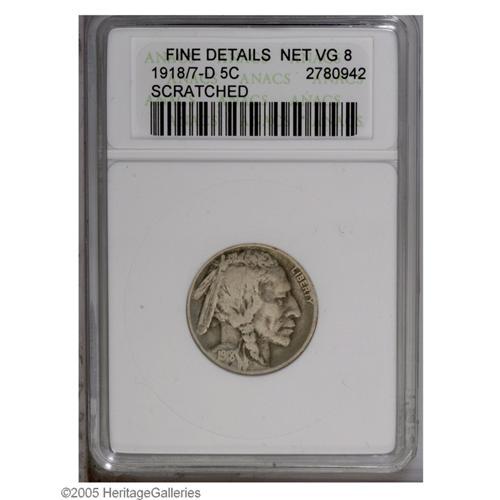 <B>1918/7-D<5C>--Scratched--ANACS. Fine Details, Net VG8.</B></I> FS-016.5. The thick diagonal stroke of the 7 is obvious within the 8 in the date. This circulated key date Nickel is generally dove-gray in color, and is problem-free aside from a short horizontal mark beneath the Indian's nose.<BR><I>From The New Zealand Collection.</B></I>