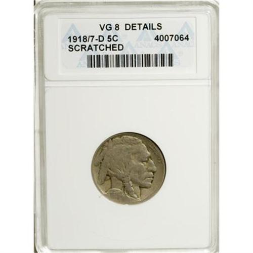 <B>1918/7-D 5C --Scratched--ANACS. VG8 Details.</B></I> Though heavily worn, this gold-tinged nickel-gray representative still displays the flat-topped 8 that signals this popular overdate. A circular cut that passes through LIBERTY and other peripheral obverse elements is the reason for the details grade.<BR><BR><B>Coin Engraver:</B> James E. Fraser<BR><BR><b>Shipping:</b> Coins & Currency (<a target="_blank" href="http://www.heritageauctions.com/common/shipping.php">view shipping information</a>)