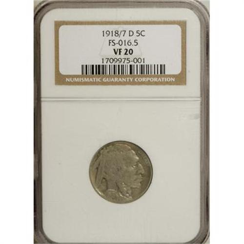 <B>1918/7-D 5C VF20 NGC.</B></I> FS-016.5. The rush to coinage at the nation's mints during the nationwide shortage near the end of World War One was apparently responsible for a number of overdates and other coin varieties--intentional and accidental--created during the era, including the 1918/7-S Standing Liberty quarter, the 1917 Doubled Die Reverse Buffalo nickel, and the present variety. The pleasing silver-gray surfaces show no mentionable distractions, and the thick downstroke of the 7 is apparent.<BR><BR><B>Coin Engraver:</B> James E. Fraser<BR><BR><b>Shipping:</b> Coins & Currency (<a target="_blank" href="http://www.heritageauctions.com/common/shipping.php">view shipping information</a>\)