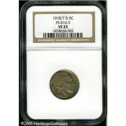 <B>1918/7-D 5C VF25 NGC.</B></I> The overdate features are crisp and clear, and the diagnostic die crack on the Indian's cheek is visible just above the hair braid. Pleasing medium gray surfaces with darker toning. Lot:5974