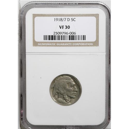 <B>1918/7-D<5C> VF30 NGC.</B></I> This modestly circulated piece has exceptional surfaces and attractive light gray color. A few tiny surface marks are clearly consistent with the grade. The overdate feature is fully evident and the diagnostic die crack on the jaw is present. This is a desirable example.