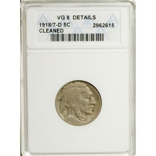 <B>1918/7-D 5C --Cleaned--ANACS. VG8 Details. </B></I> FS-016.5. This example is moderately worn but shows few marks on the light beige-gray surfaces. An unusually satiny appearance is the result of harsh cleaning. The 1918/7 overdate has become an important key date in the Buffalo nickel series. <BR><BR><B>Coin Engraver:</B> James E. Fraser<BR><BR><b>Shipping:</b> Coins & Currency (<a target="_blank" href="http://www.heritageauctions.com/common/shipping.php">view shipping information</a>)