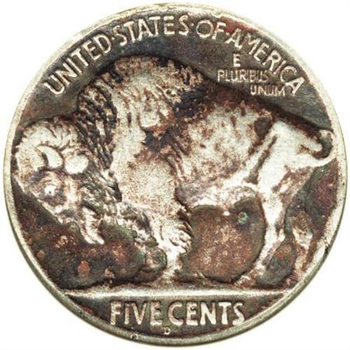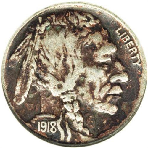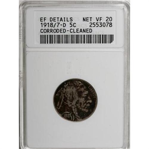 <B>1918/7-D 5C --Corroded, Cleaned--ANACS. XF Details, Net VF20.</B></I> FS-016.5. The all-important 8 over 7 feature is bold. This key date nickel has deep lavender-mauve patina that has flaked off here and there, leaving a granular surface. The highpoints are gray and exhibit moderate wear. Hairlines are limited to the bison's hipbone.<BR><I>From The Chippewa Valley Collection.</B></I><BR><BR><B>Coin Engraver:</B> James E. Fraser<BR><BR><b>Shipping:</b> Coins & Currency (<a target="_blank" href="http://www.heritageauctions.com/common/shipping.php">view shipping information</a>)