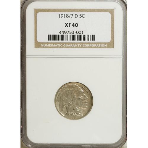 <B>1918/7-D 5C XF40 NGC.</B></I> A lightly worn but appealing example with pretty greenish-gray and gold patina over each side. The "corner" at the upper right part of the 8 is visible to the unaided eye, and the overdate is plain with low-level magnification. A few light handling marks affect the devices, but these are generally unobtrusive. A pleasing example of this popular overdate.<BR><BR><b>Shipping:</b> Coins & Currency (<a target="_blank" href="http://www.heritageauctions.com/common/shipping.php">view shipping information</a>)