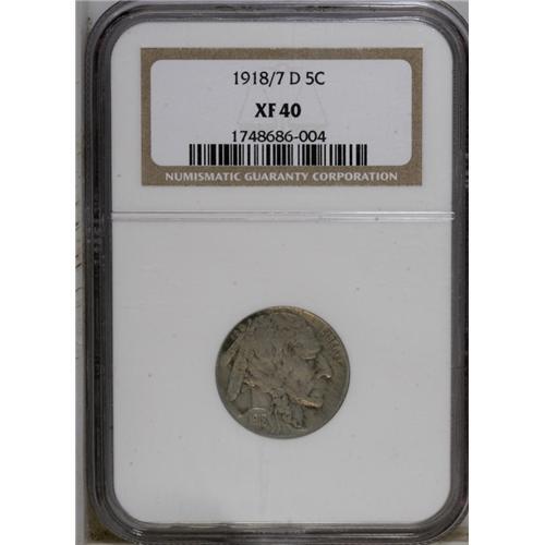 <B>1918/7-D<5C> XF40 NGC.</B></I> The upper right corner of the 7 is clear, and its downstroke is separated from the upper loop of the 8. The base of the 7 merges with the left border of the lower loop of the 8. An evenly circulated slate-gray example with a bold mintmark and selected softness on the tops of LIBERTY. Along with the 1916 doubled die, the 1918/7-D is the key to a complete set of the distinctively American series.