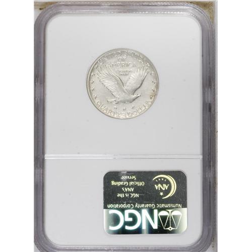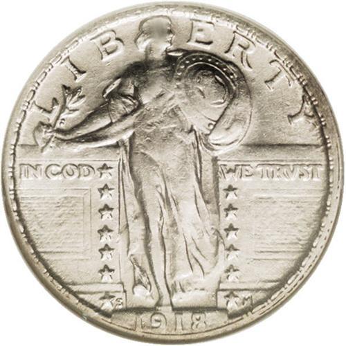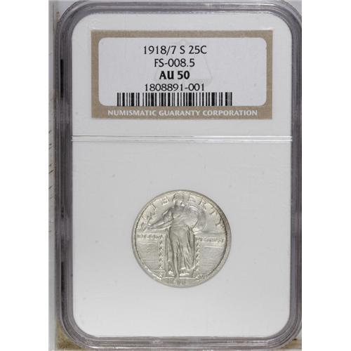 <B>1918/7-S 25C AU50 NGC.</B></I> FS-008.5. The crossbar and downstroke of the underdigit 7 are apparent without the aid of a lens. Substantial luster traverses this lightly toned example. Liberty's waist and leg show a hint of friction, and the center of the head is dished, usual for the issue. There are no relevant marks. Struck from moderately clashed dies. In the AU50 grade, the 1918/7-S and the 1916 are the two keys to the Standing Liberty series, and are priced equivalently. In Mint State, however, the 1918/7-S is the unquestioned key, since the 1916 was set aside in greater numbers.<BR><BR><b>Shipping:</b> Coin/Currency (<a target="_blank" href="http://www.heritageauctions.com/common/shipping.php">view shipping information</a>)